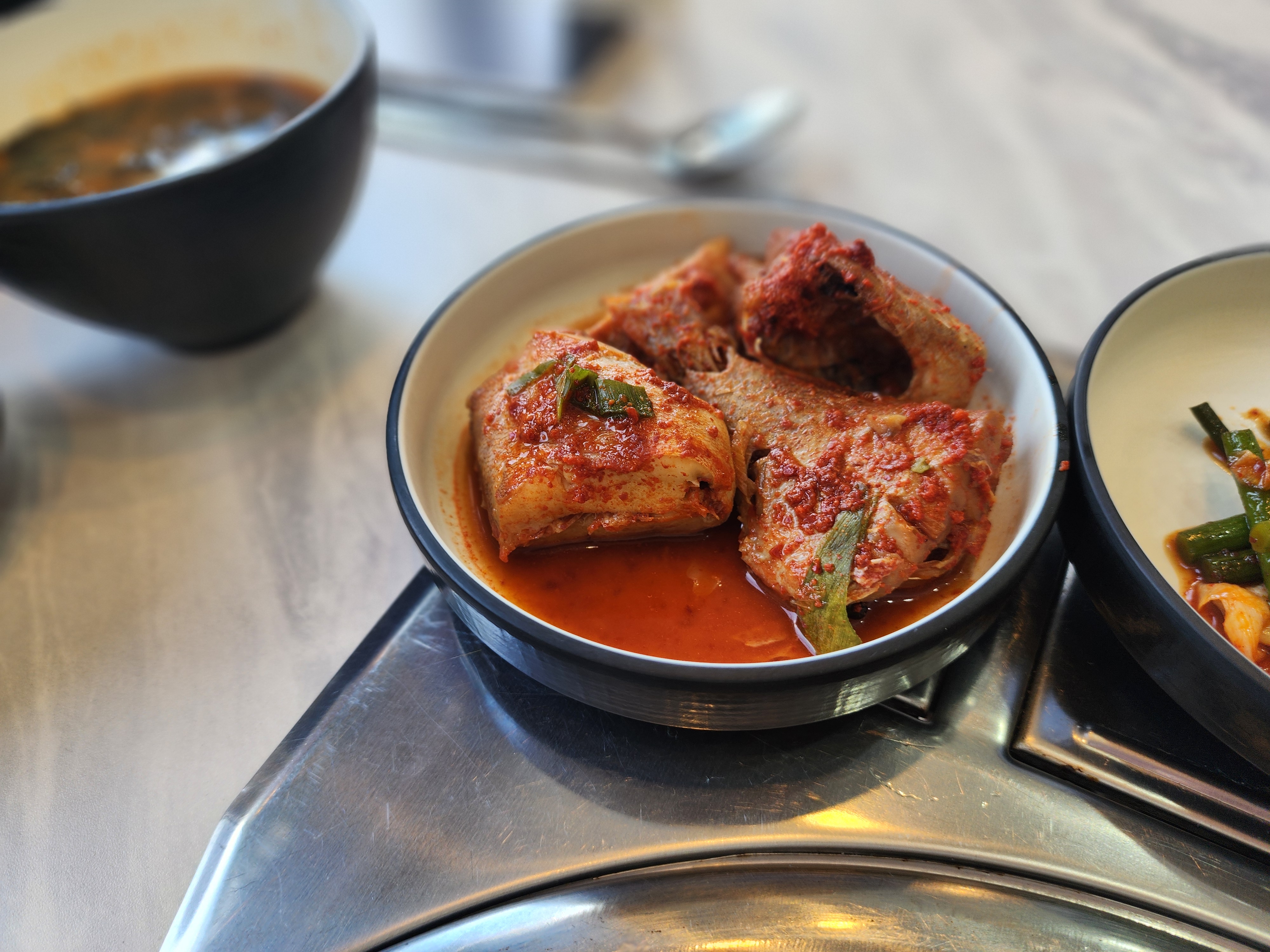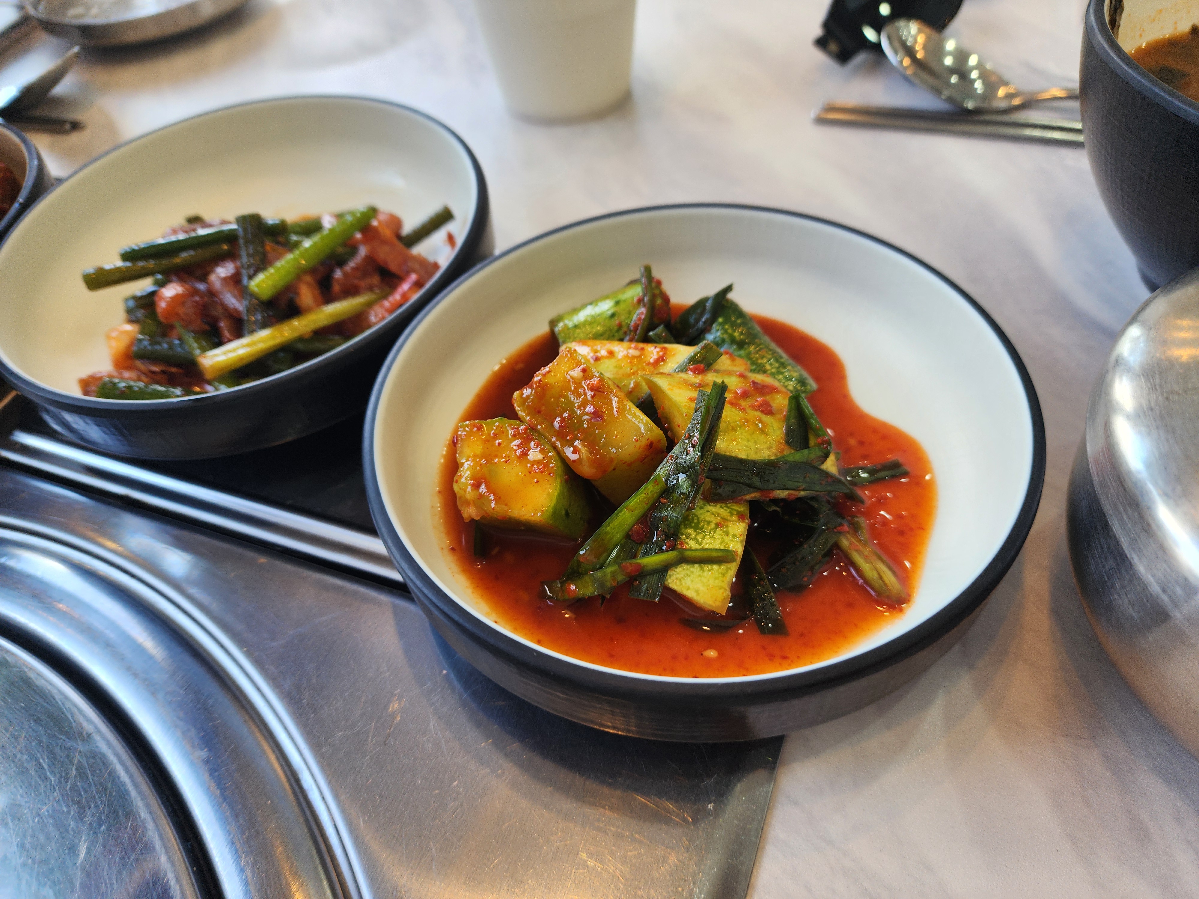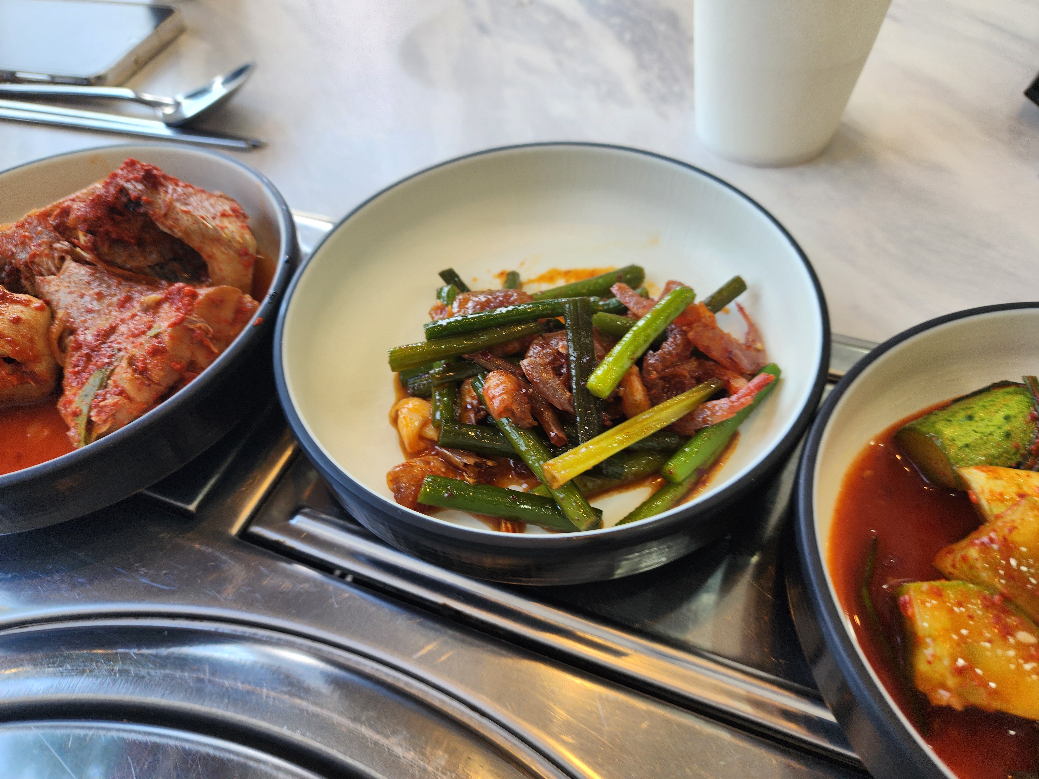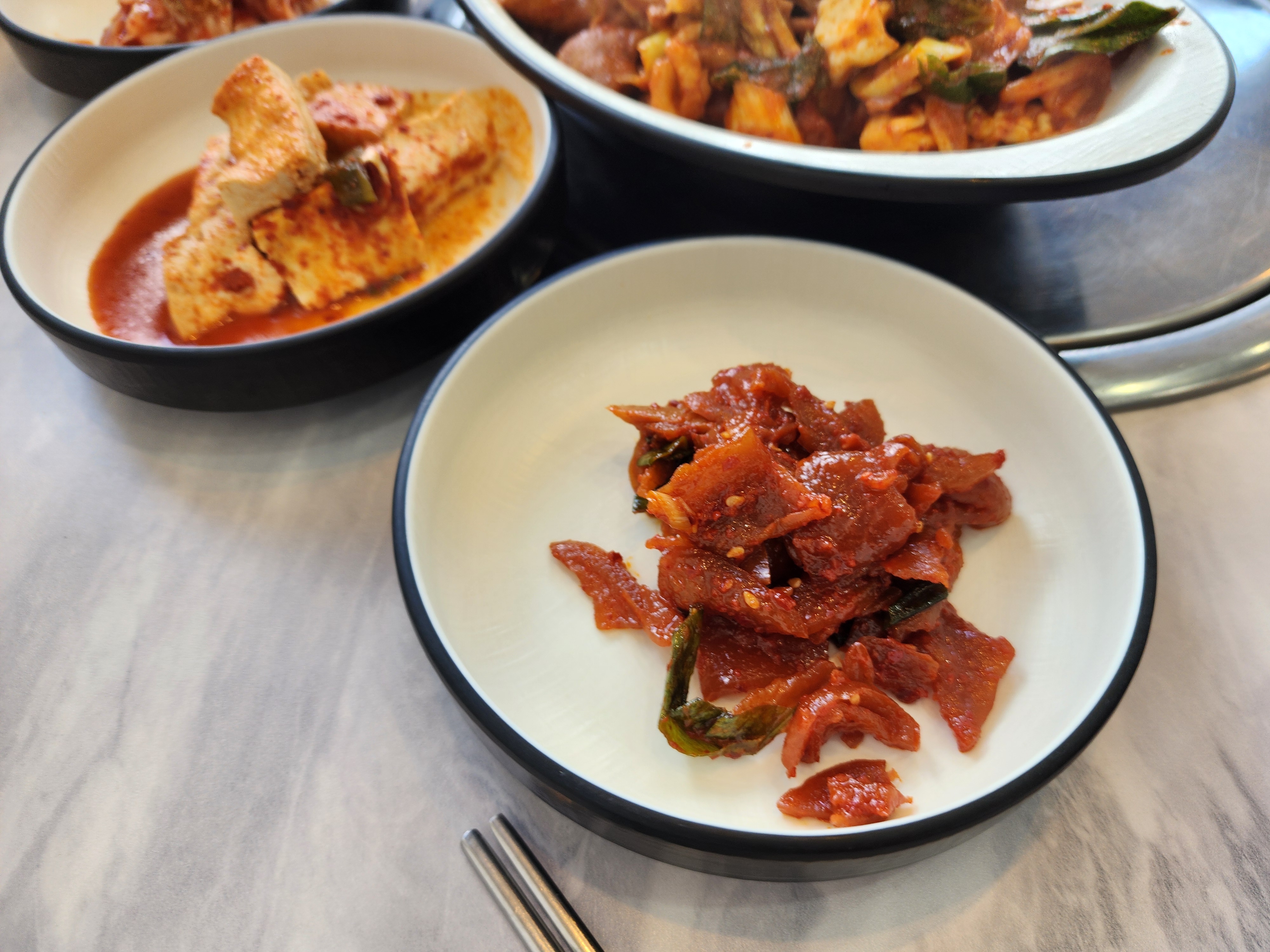 밑반찬은 다 간이 딱 맞아서 맛있게 먹었습니다. 오이소박이도 있고 마늘쫑새우볶음도 있고 코다리볶음도 있고 두부무침과 김치 그리고 무말랭이무침도 있었습니다.